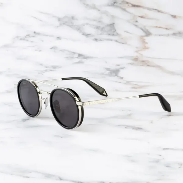 De ronde glazen worden verbonden door een verlengde dubbele neusbrug met gegraveerde Milanese-details – een motief geïnspireerd op de originele horlogebanden van Breitling. De zonnebril is met de hand vervaardigd in Japan van gepolijst titanium.
