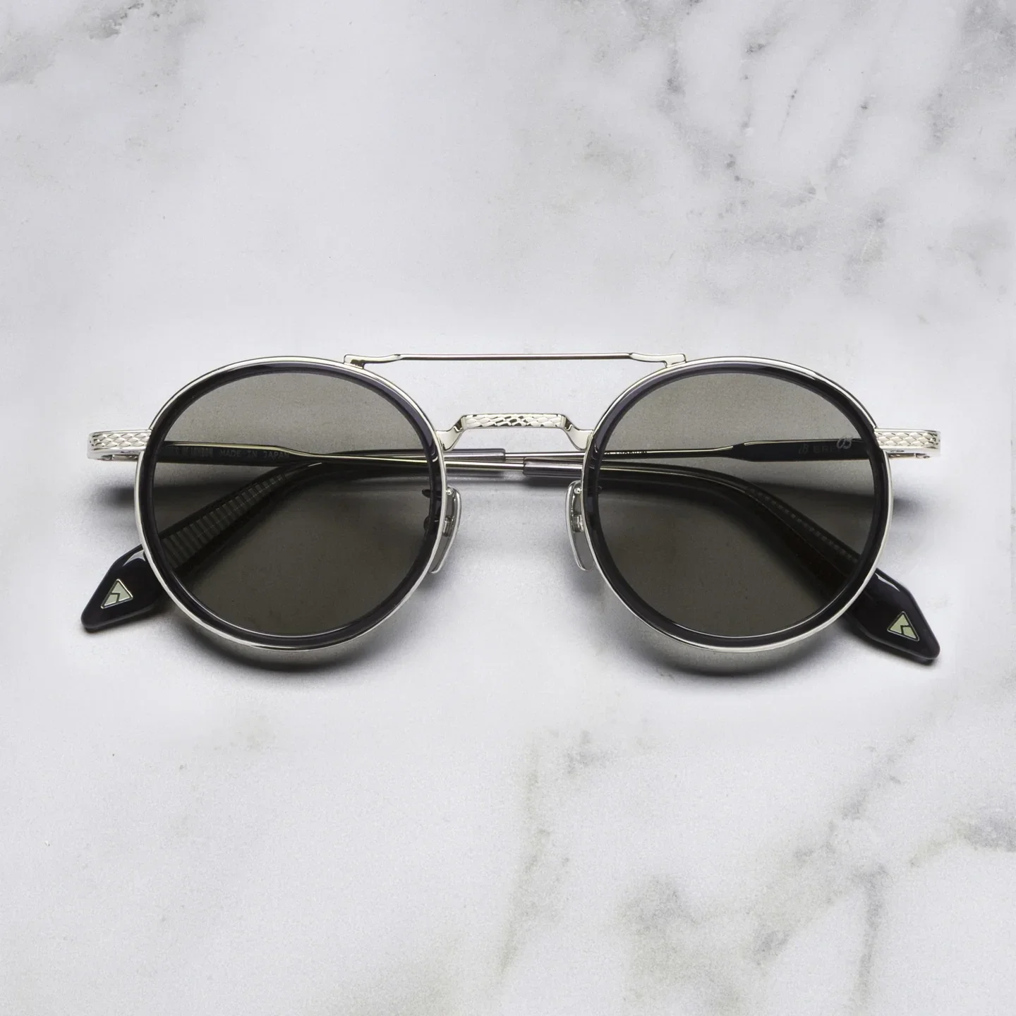 De ronde glazen worden verbonden door een verlengde dubbele neusbrug met gegraveerde Milanese-details – een motief geïnspireerd op de originele horlogebanden van Breitling. De zonnebril is met de hand vervaardigd in Japan van gepolijst titanium.