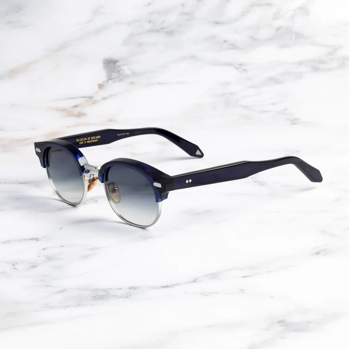 De gedurfde wenkbrauwlijn en de diepte van het metaalwerk geven de 0003 zonnebril een stoere uitstraling. Het vintage-geïnspireerde montuur, ontworpen in samenwerking met Breitling, is handgemaakt van milieuvriendelijk celluloseacetaat in een gelaagd ontwerp dat de metalen componenten eronder zichtbaar maakt.